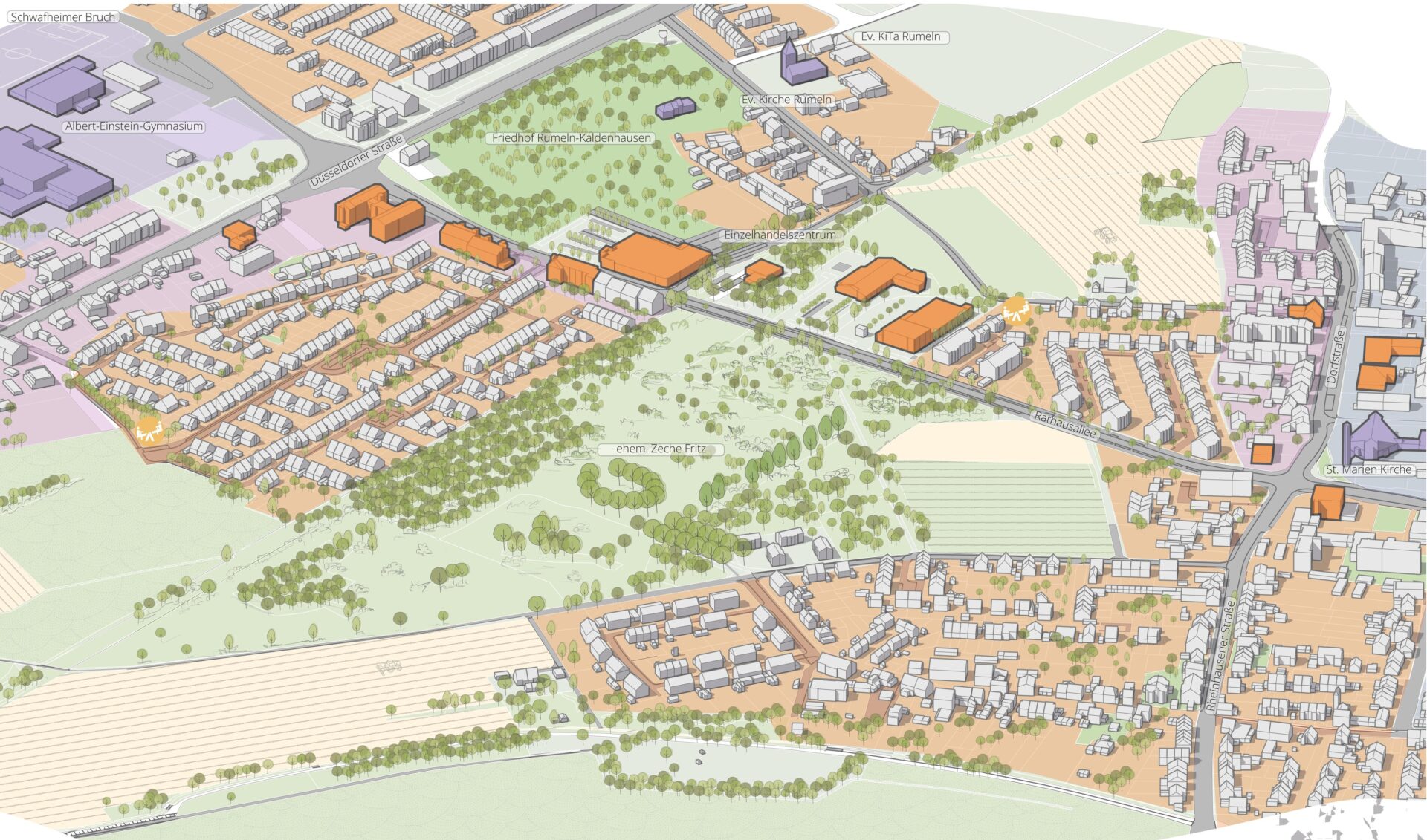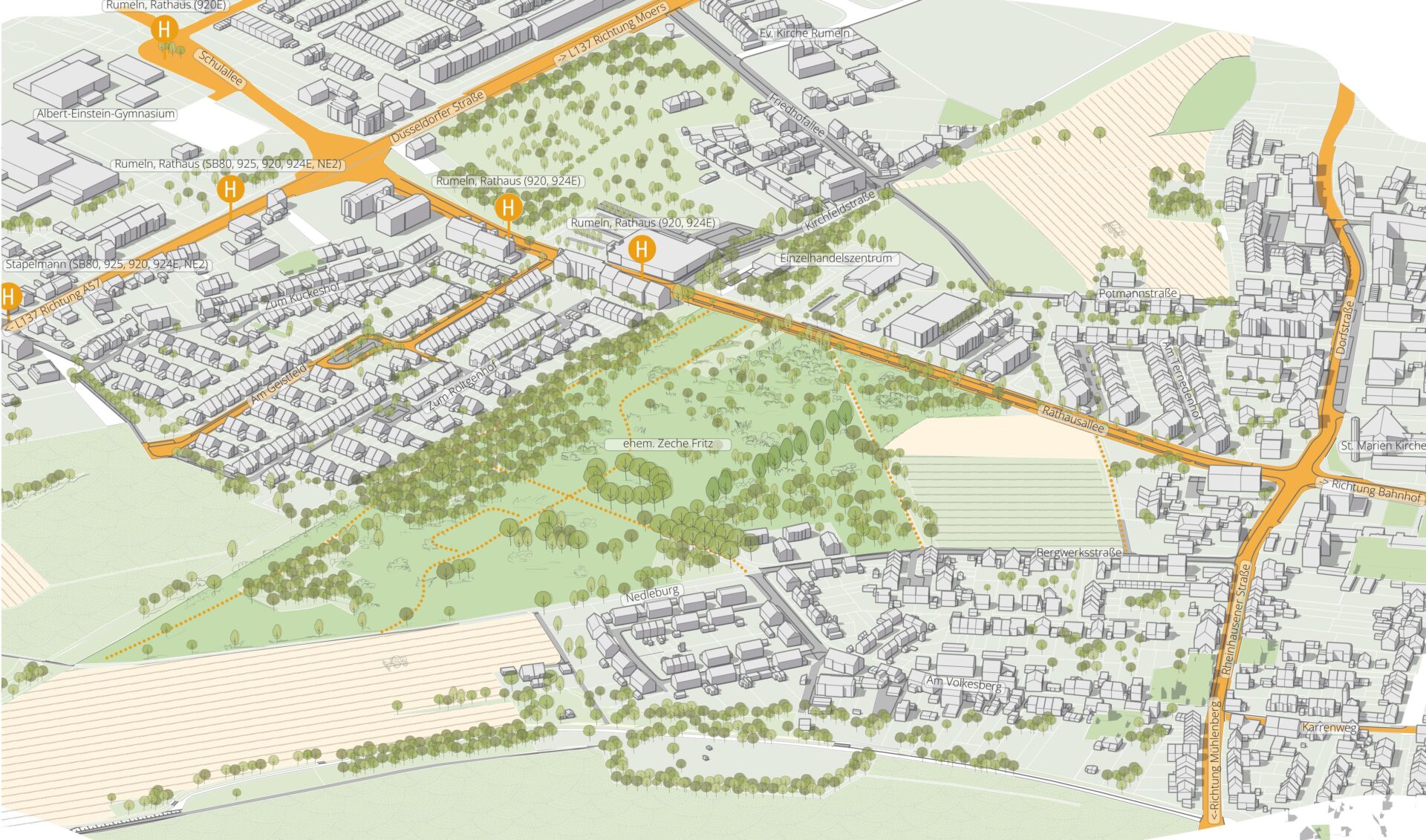 Das Gelände der ehemaligen Zeche Fritz im Duisburger Stadtteil Rumeln-Kaldenhausen prägt mir seiner Bergbau-Geschichte den Stadtteil bis heute maßgeblich. Seit dem Ende des Bergbaus in den 1970er hat die Fläche einen Wandel erlebt welcher im Zuge der Rahmenplanung geordnet werden soll. Die über die Jahre entstandenen, hochwertigen Grünstrukturen sollen dabei ebenso in den Entwurf einfließen wie eine neue, hochwertige Wohnbebauung. Das Ziel ist ein Quartier welches die Nachbarschaft in alles Facetten bereichert.