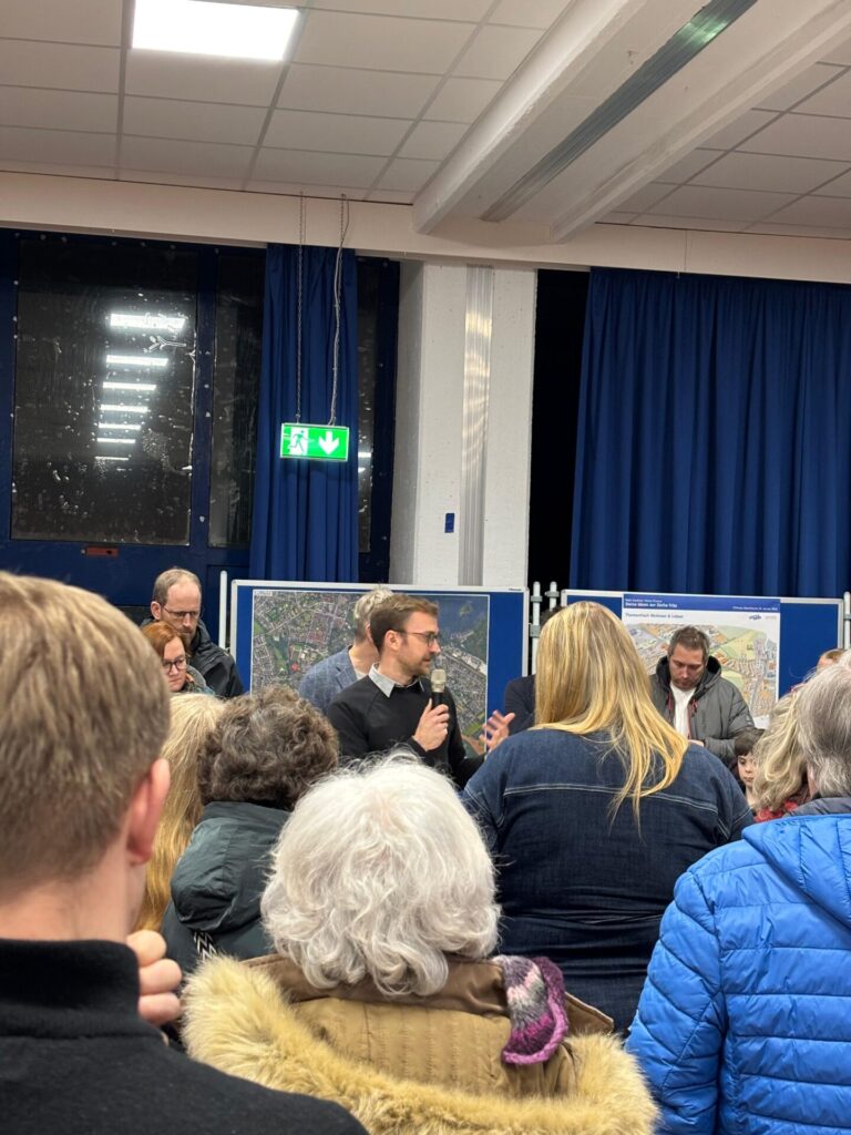 Das offene Ideenforum im Albert-Einstein-Gymnasium wurde dabei von über 150 Interessenten besucht. Im Vorausgang fand ein gemeinsamer Spaziergang über das Gelände statt um allen Teilnehmenden einen Eindruck des Gebietes zu vermitteln. Nach einem kurzen Auftakt im Plenum wurde an drei verschiedenen Tischen gemeinsam diskutiert. Der Fokus lag auf den Themen Mobilität, Wohnen und Leben sowie Freiraum und Klima. Im Anschluss an die Diskussion wurden die Ergebnisse in gemeinsamer Runde allen Teilnehmenden vorgestellt. Zuletzt gab es noch einen Ausblick auf das weitere Verfahren.