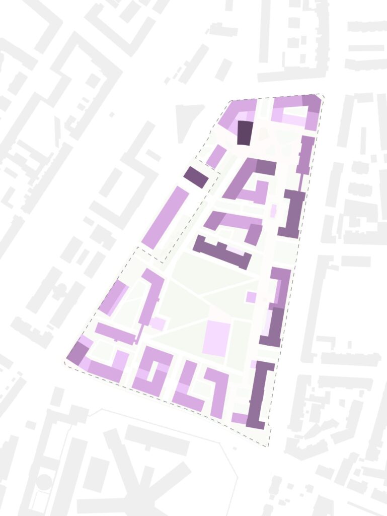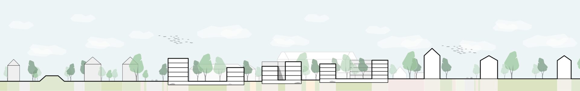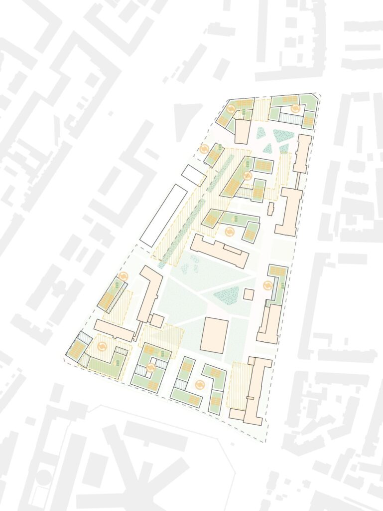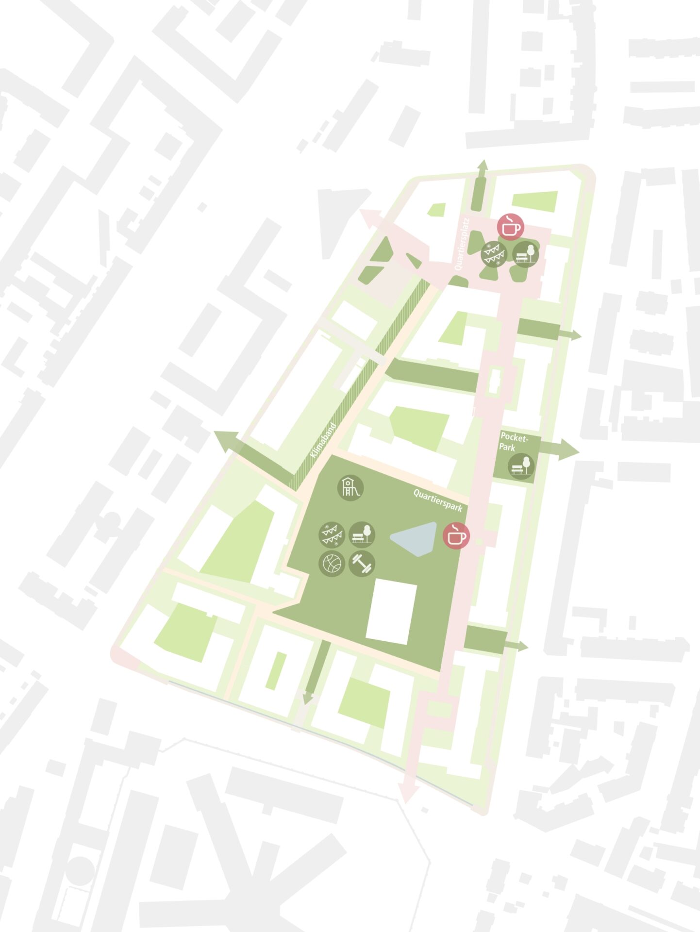 Die räumliche Ordnung bildet im Norden einen kompakten Quartiersplatz und im Süden einen Park als grünes Herz der Anlage aus. Im Osten erhalten und stärken wir die Alte Campusachse zu einer attraktiven Promenade. Im Westen integrieren wir ein neues Klimaband, das den Übergangsbereich zur benachbarten Planung attraktiviert und adressiert, der bislang als Rückseite wirkte. Weitgehend geschlossene Raumkanten fassen die Räume klar und schaffen hochwertige Adressen.