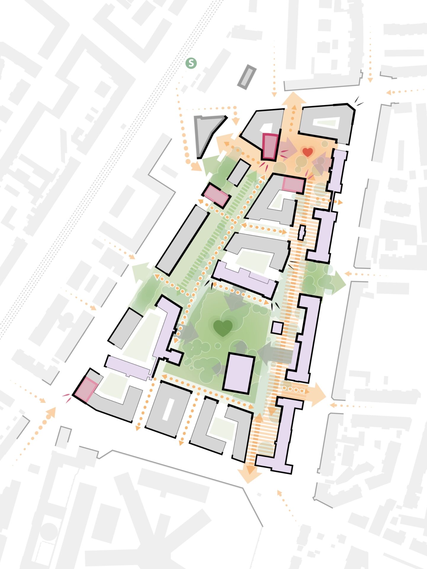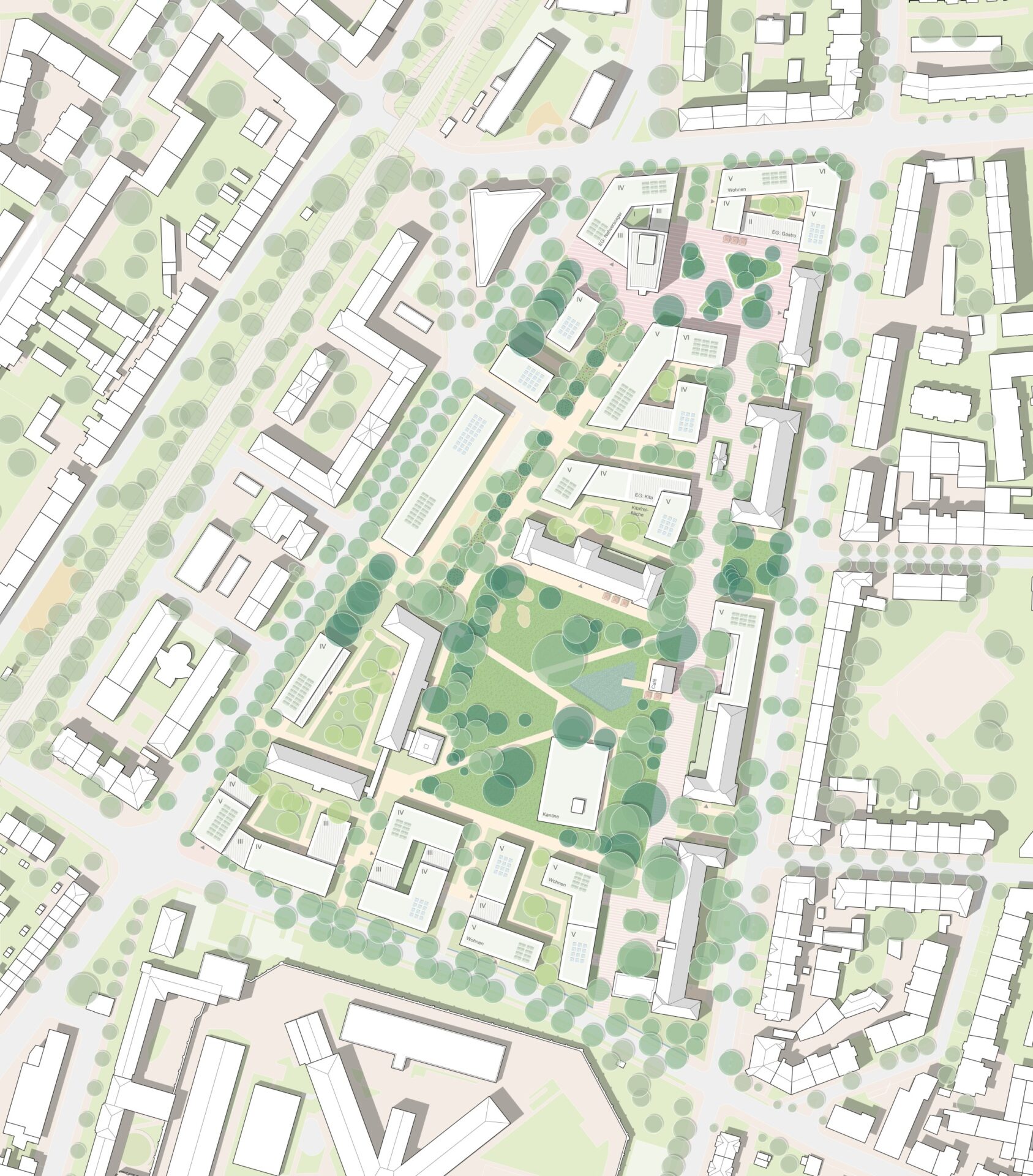 Aus der offenen Heterogenität des Bestands entsteht eine kompakte, verbindliche Identität. Das Leitmotiv Schale und Kern führt Alt und Neu zusammen: Der Bestand bildet überwiegend die robuste Hülle, und behutsame Ergänzungen setzen leistungsfähige Kerne für zeitgemäße Arbeitswelten. Die Durchlässigkeit der Wegeverbindungen macht den Campus öffentlich lesbar, aktiviert die Ränder und stärkt die Orientierung. Das zentrale Bestandsgebäude des Veterinärwesens bildet die repräsentative Schaufassade zum Park.