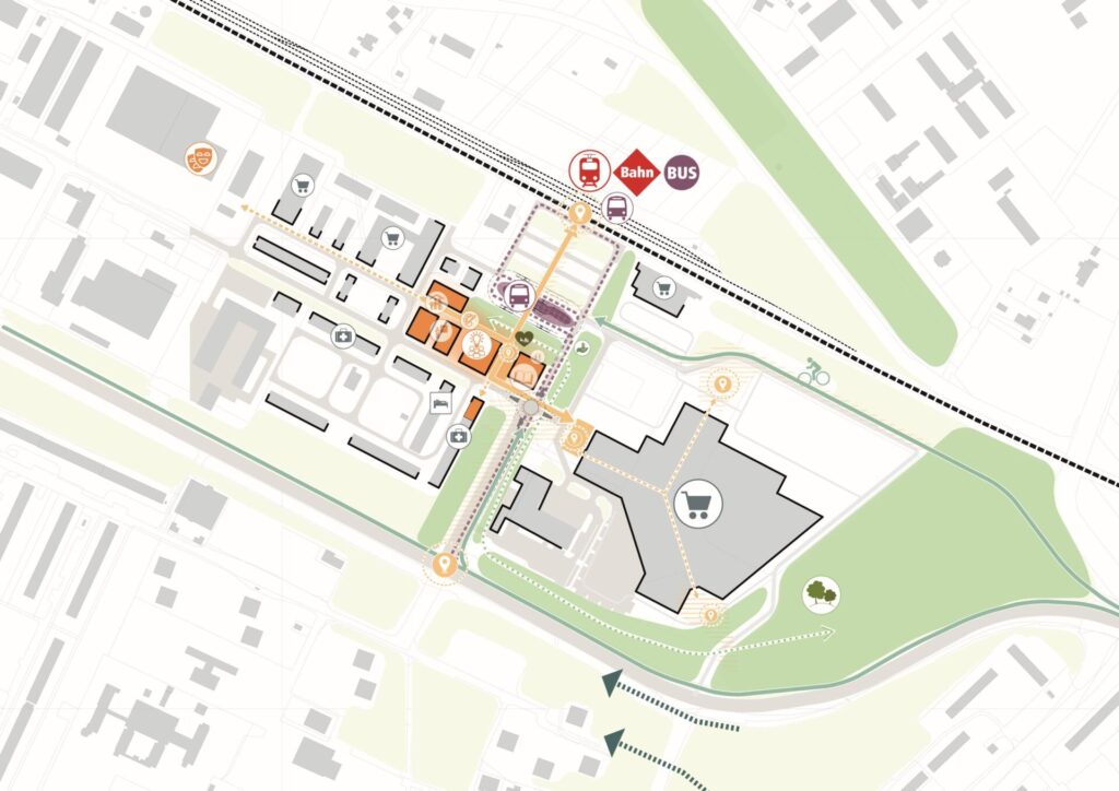 Ergebnis dieser Machbarkeitsstudie sind zwei städtebauliche Varianten, die unterschiedliche Stärken und Qualitäten aufweisen. In beiden Varianten wurde die verkehrlich schwierige Situation an der Handelsstraße gelöst, um dem entstehenden Campus eine klare Eingangssituation zu schaffen. Der ZOB wurde neugeordnet und so die Abhängigkeiten der unterschiedlichen Verkehrsteilnehmer*innen aufeinander abgestimmt und optimiert.